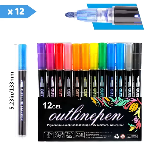 12 stk Fargede Outline Marker Metallisk Gelpennsett