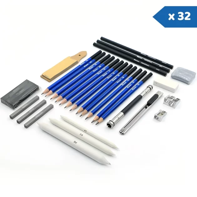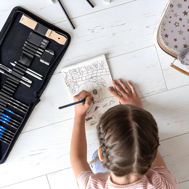 Dette skissetsettet er flott for tegningene mine hjemme og på skolen! Alle blyantene er i ett etui, så det er superlett å ta med seg.