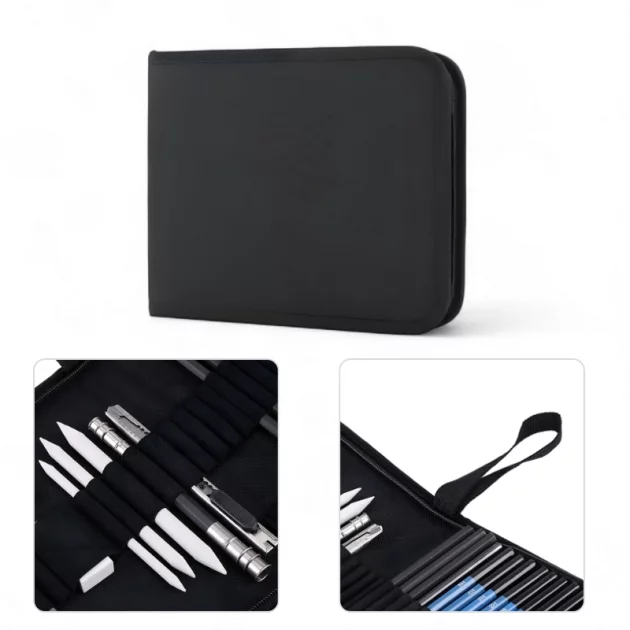 Jeg liker hvordan blyantene fungerer for tykke eller tynne streker. Etuiet er solid, så ingenting blir borte i sekken min.