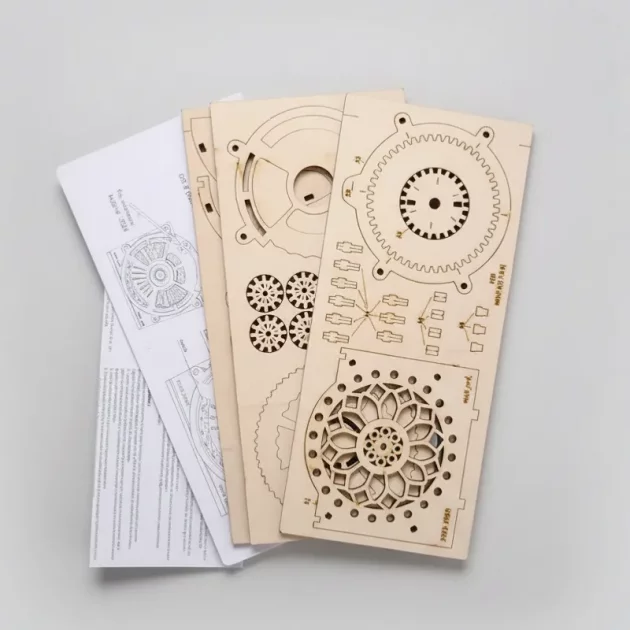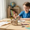 Dette byggesettet i tre tok en stund å bygge, men jeg lærte om alle de små tannhjulene. Og viskelærene og notislappene mine passer perfekt.