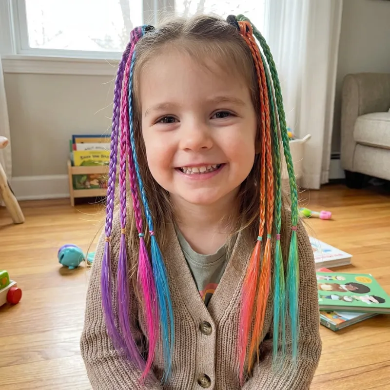 Lillejenta mi hater stramme strikker, men disse føles myke mot hodebunnen. Ingen tårer, ingen røde merker, bare sterke farger og et stort smil.