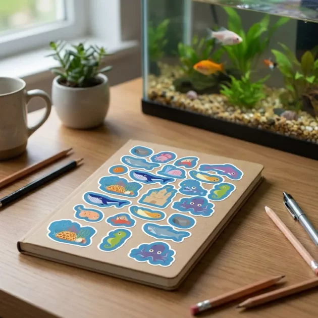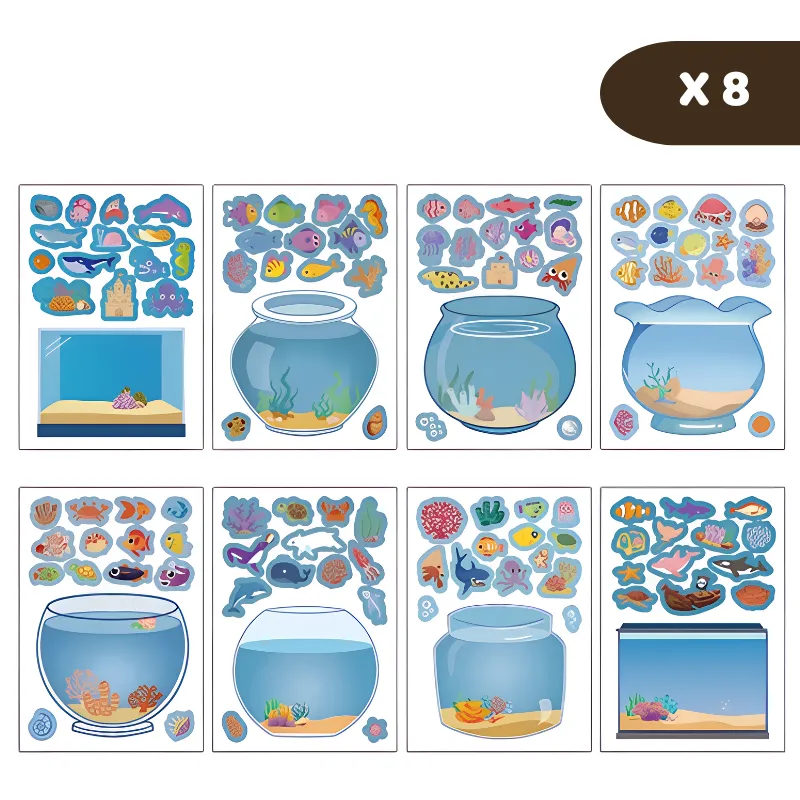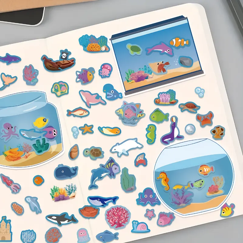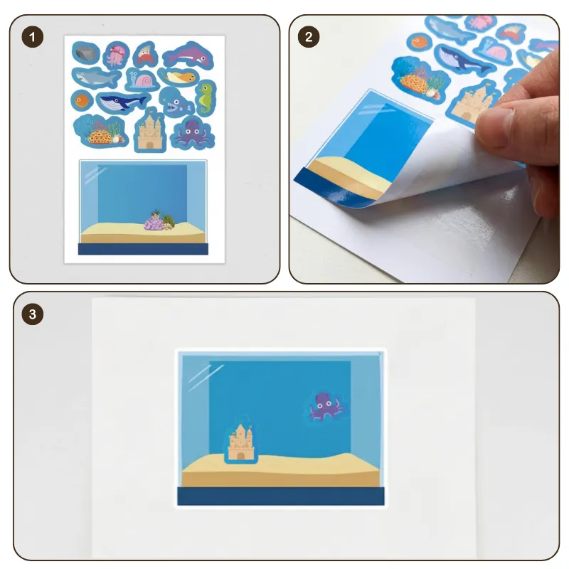 Forvandle en regnfull ettermiddag til en kreativ reise. Fargerike klistremerker bringer havets magi til live. Hver aktivitet holder små hender opptatt og inspirerer fantasien. Nyt kvalitetstid og latter mens barnet ditt bygger sitt drømmeakvarium.