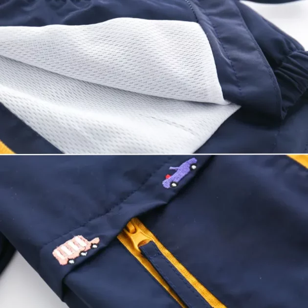 Barnet elsker den enkle glidelåsen og den sterke fargen. Han har til og med små leker i lommene sine. Sitter på under lek, og vaskes også godt.