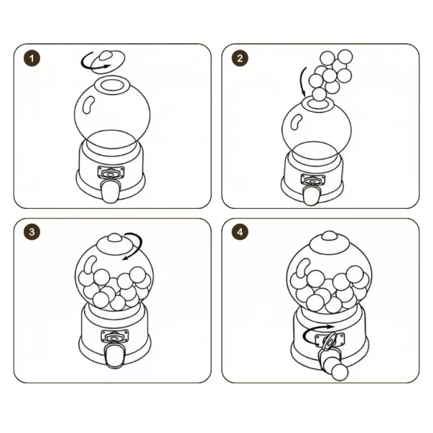 Min lillebror får ikke nok av denne tyggegummimaskinen! Han elsker å dreie på håndtaket og dele godteri med alle. Vi har den på kjøkkenbordet.