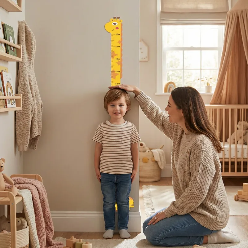 Vi dokumenterte sønnen min sitt årlige høydepsprang med giraffen. Hver markering føles spesiell, og den kom av veggen uten merker. Perfekt for bilder også.