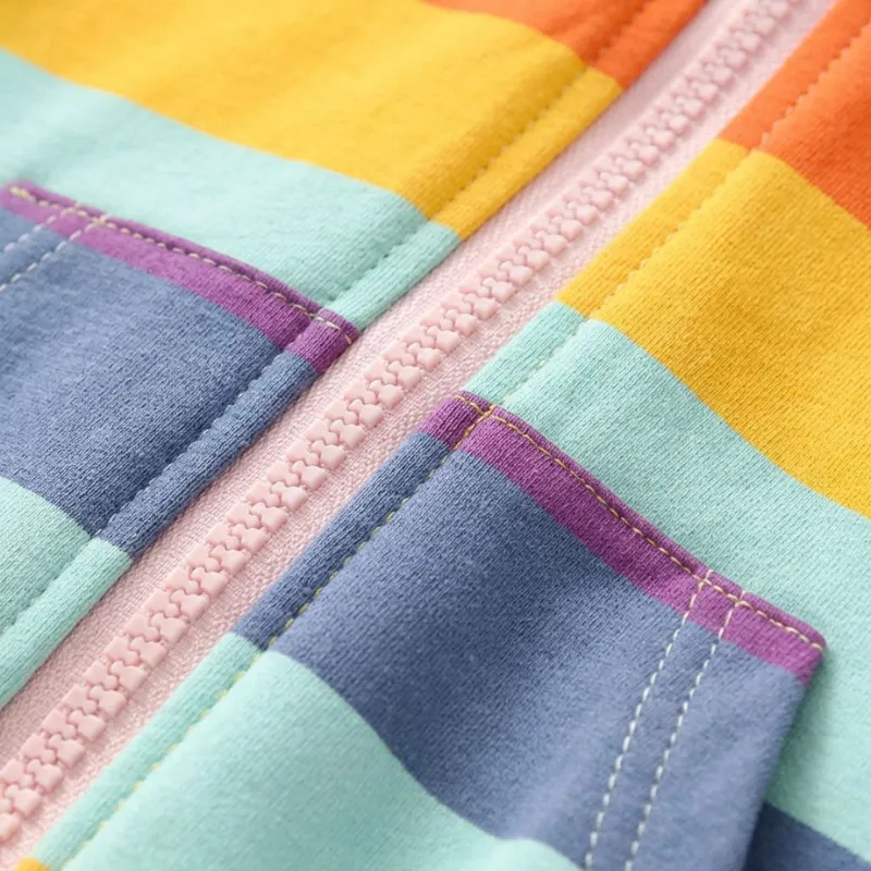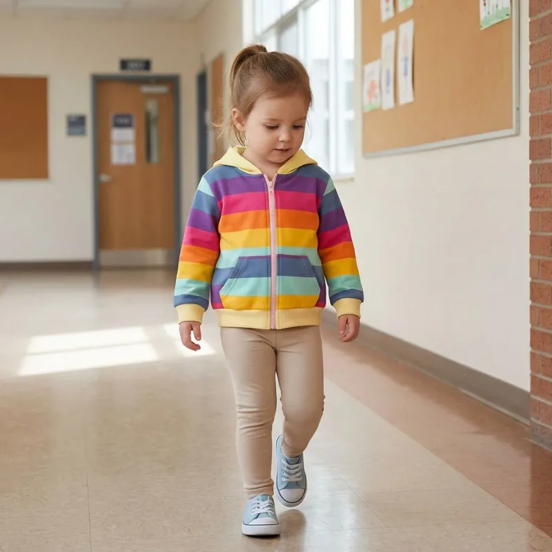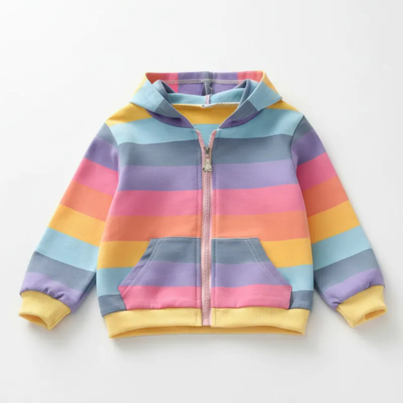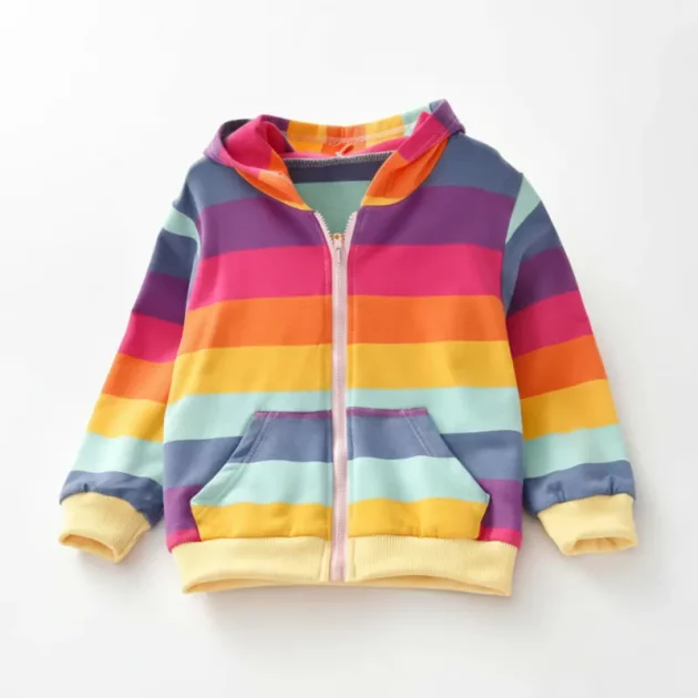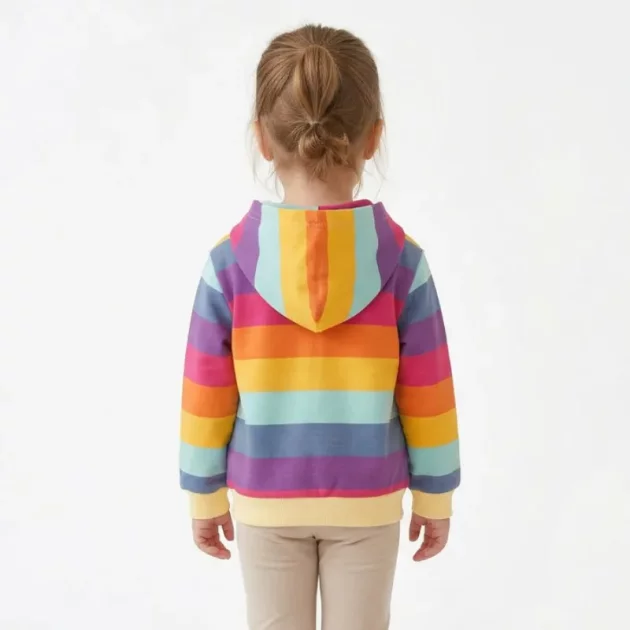 Denne regnbue-hettejakken gir et smil hver gang. Bomullsblandingen føles glatt, og barnet mitt klager aldri på kløende sømmer eller lapper.