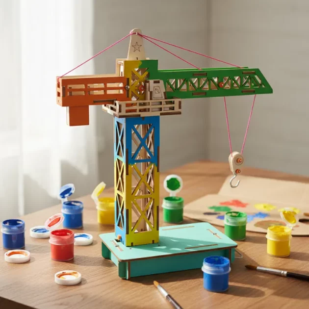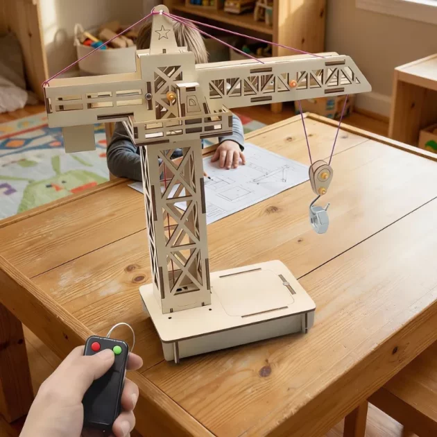 Å bygge hjalp meg å fokusere og jobbe nøye. Kranen flytter faktisk ting rundt, det overrasket meg! Elsker det naturlige utseendet på treverket.