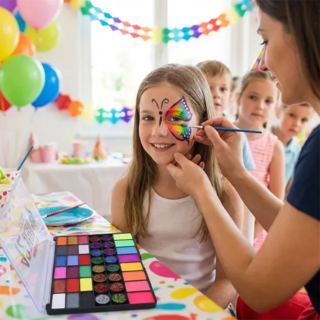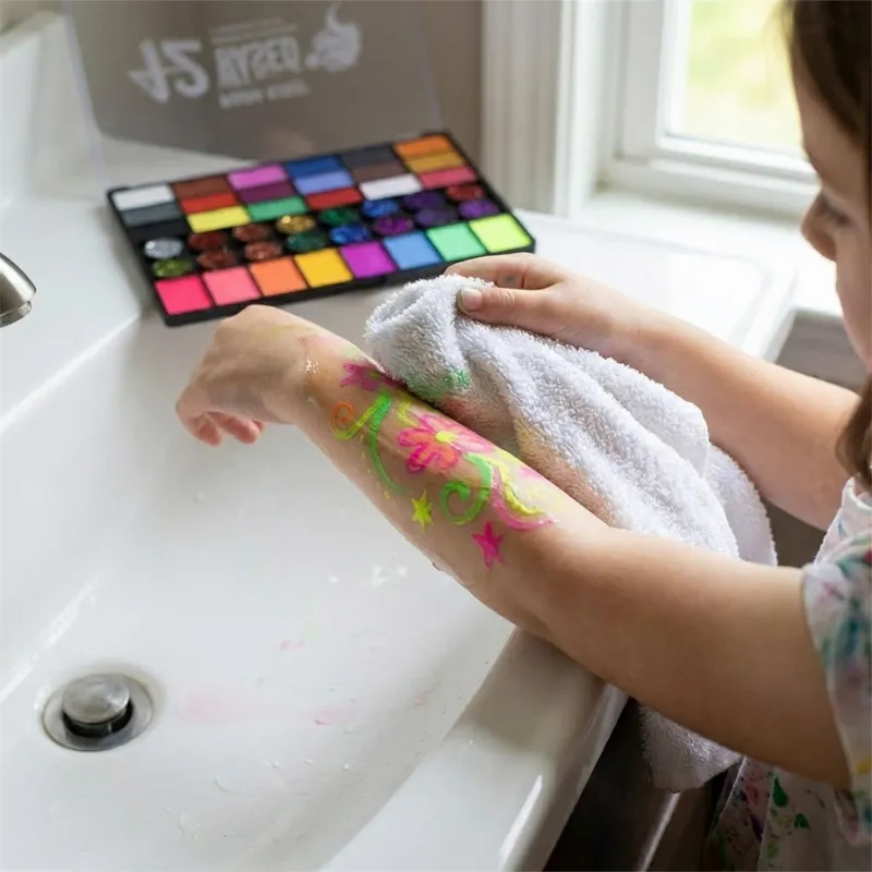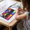 Jeg er barnevakt og tok med denne paletten til en filmkveld. Barna brukte en time på å male ansikter, og så vasket det seg raskt av før foreldrene kom.