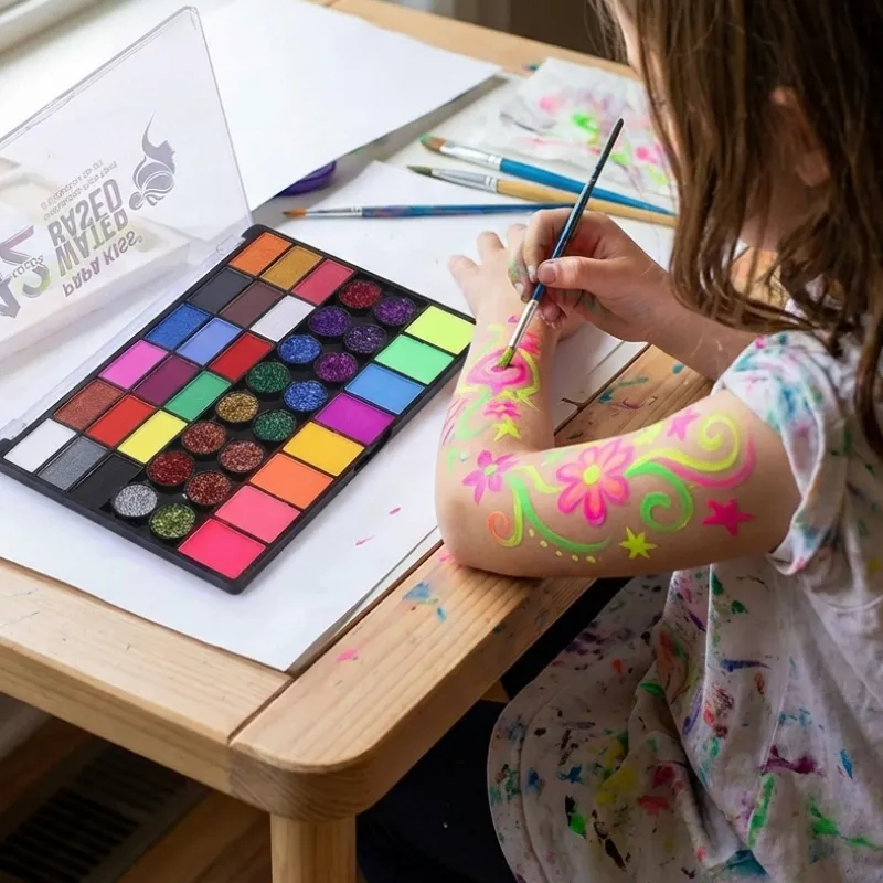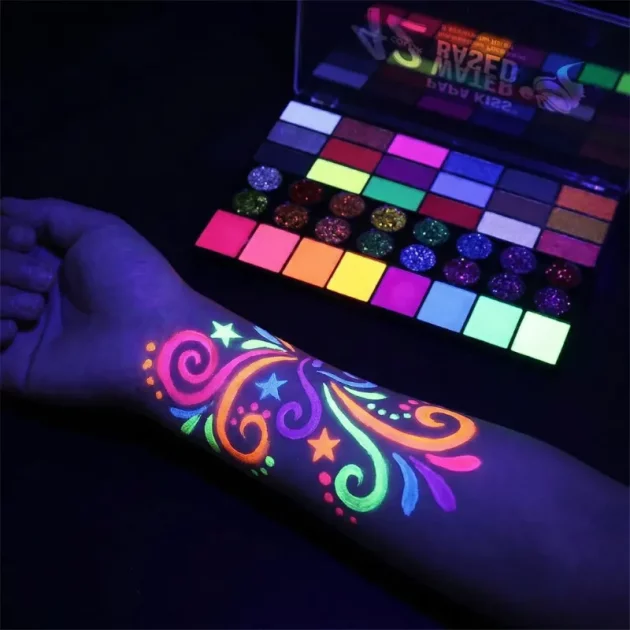 Kjøpte dette malesettet til datterens glow-party. Fargene var supersterke under svartlys og vasket lett av i dusjenpå.