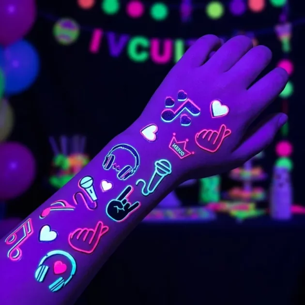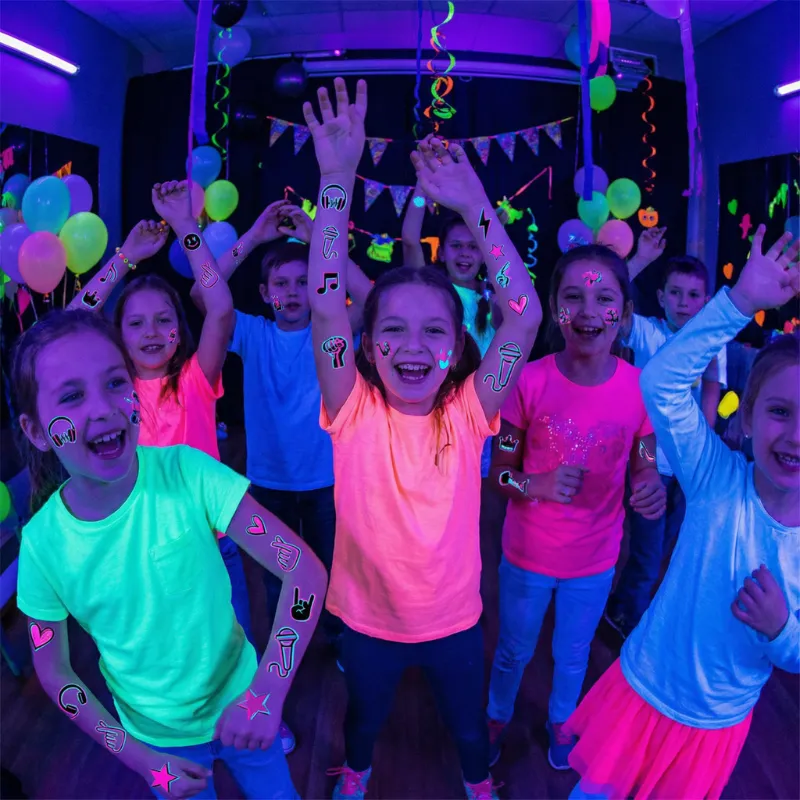 Kjøpte disse selvlysende klistremerkene til datterens dansefest. De lyste skikkelig bra under DJ-lysene og gikk lett av igjen med babyolje etterpå.