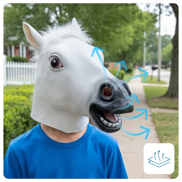 Hestemasken passer perfekt på nevøen min. Han løper rundt i huset og vrinsker. Han klager aldri på at den er trang eller varm. Alltid morsom!