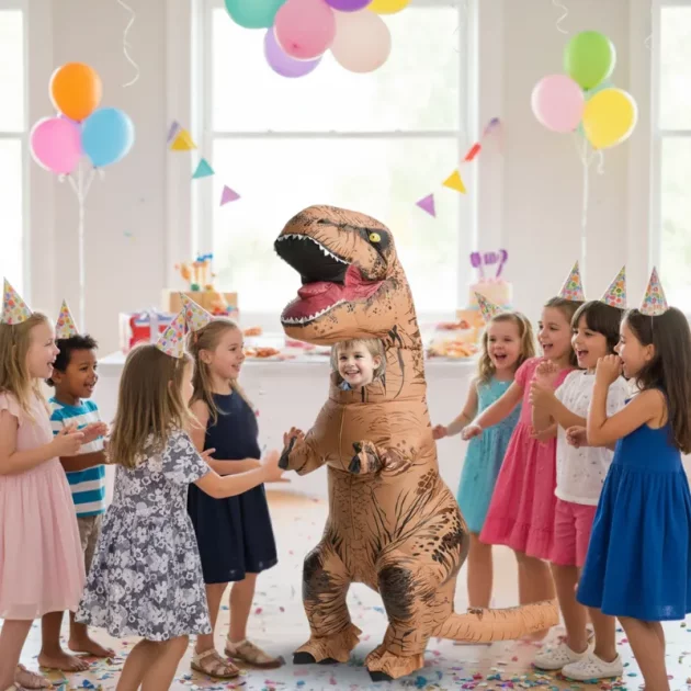 Sønnen min hadde på seg T-Rex-drakten hele dagen på bursdagen sin, løp og lo med vennene sine. Det gjorde hele dagen så mye bedre!