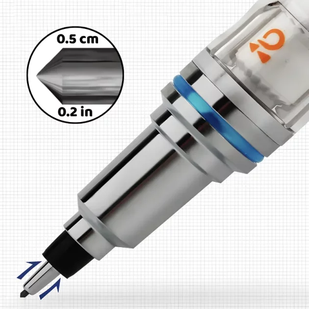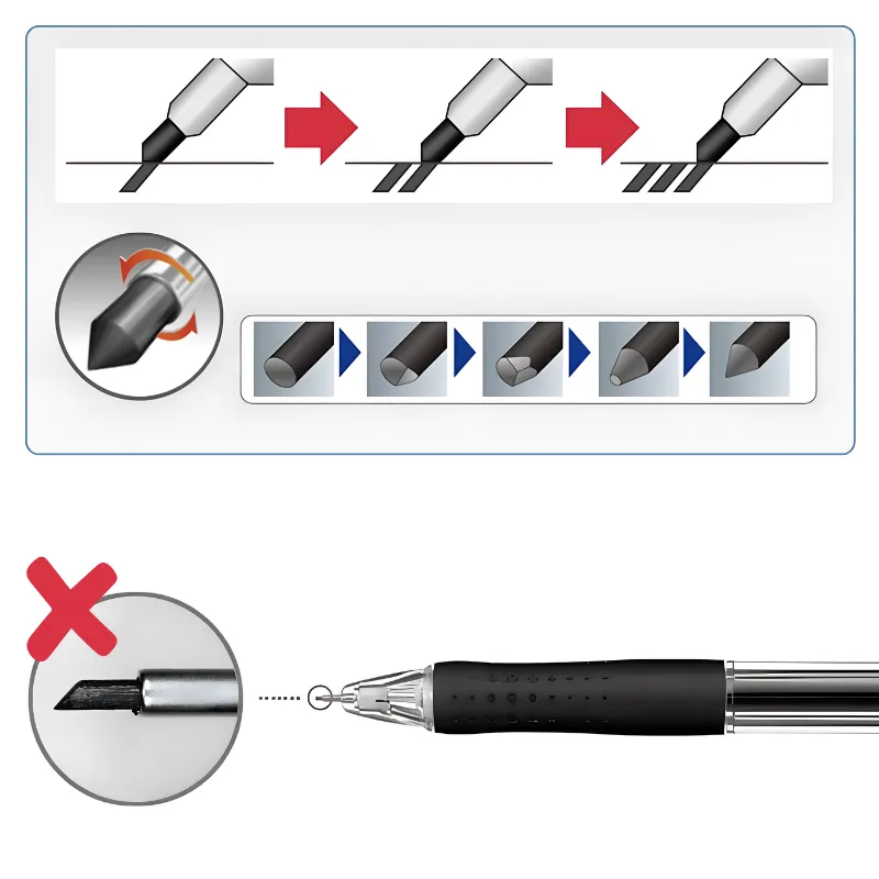 Barnas skolearbeid holder seg pent og tydelig på hver side. En smart roterende mekanisme sørger for at linjene forblir tydelige og jevne under bruk. Færre knekte bly for færre avbrytelser og mer fornøyde elever.