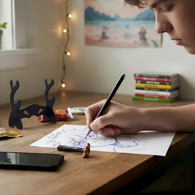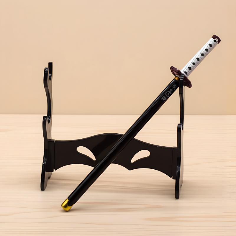 Katana-pennholderen holder datterens skrivebord så ryddig. Hun liker å ha den spesielle pennen synlig rett ved notatbøkene sine.