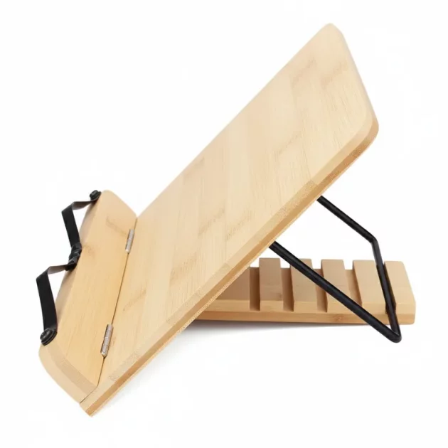 Denne lesestøtten kan slås sammen og settes i skuffen min når jeg er ferdig. Jeg synes bambusen ser veldig fin ut også.