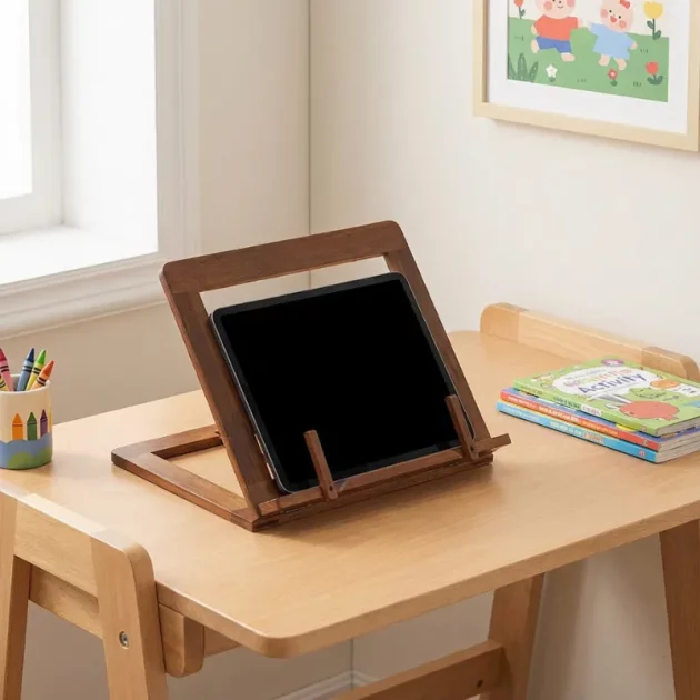 Vi bruker lesestativet sammen på kjøkkenet til oppskrifter. Lillebroren min elsker å bla i sidene selv.